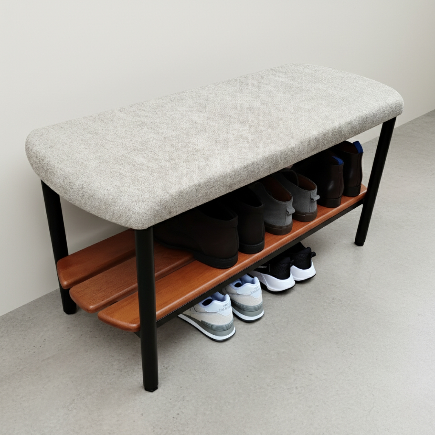 Crie um ritual diário de transição. Esta peça é o seu ponto de apoio confortável que prepara sua saída ao calçar os sapatos e recebe você na chegada, oferecendo um assento prático para descalçar. A prateleira em madeira maciça mantém seus calçados perfeitamente organizados e arejados.