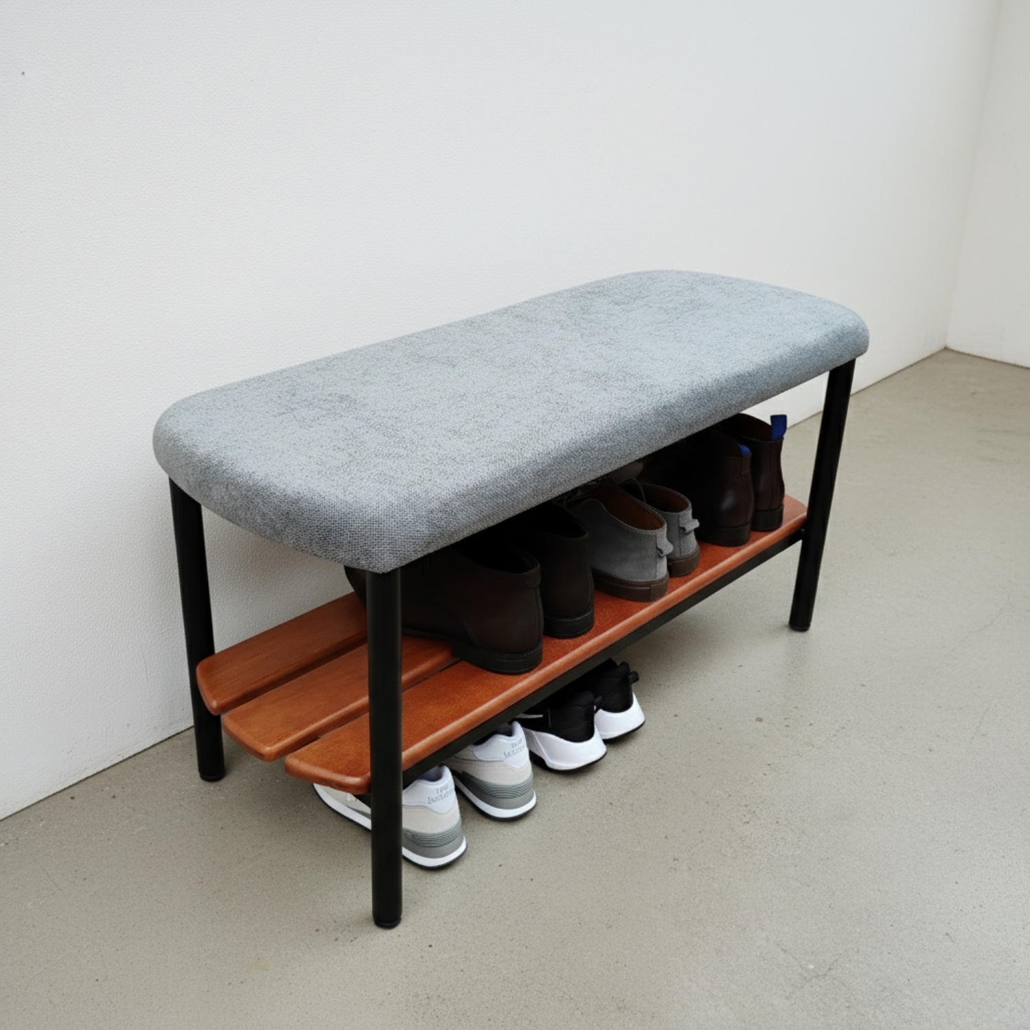 Crie um ritual diário de transição. Esta peça é o seu ponto de apoio confortável que prepara sua saída ao calçar os sapatos e recebe você na chegada, oferecendo um assento prático para descalçar. A prateleira em madeira maciça mantém seus calçados perfeitamente organizados e arejados.